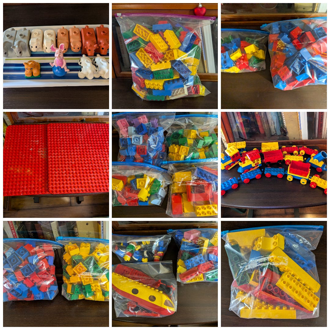 This evening after supper I finally finished all the Duplo sorting. This is not even all of it, but I wanted to give you some idea of the scope: