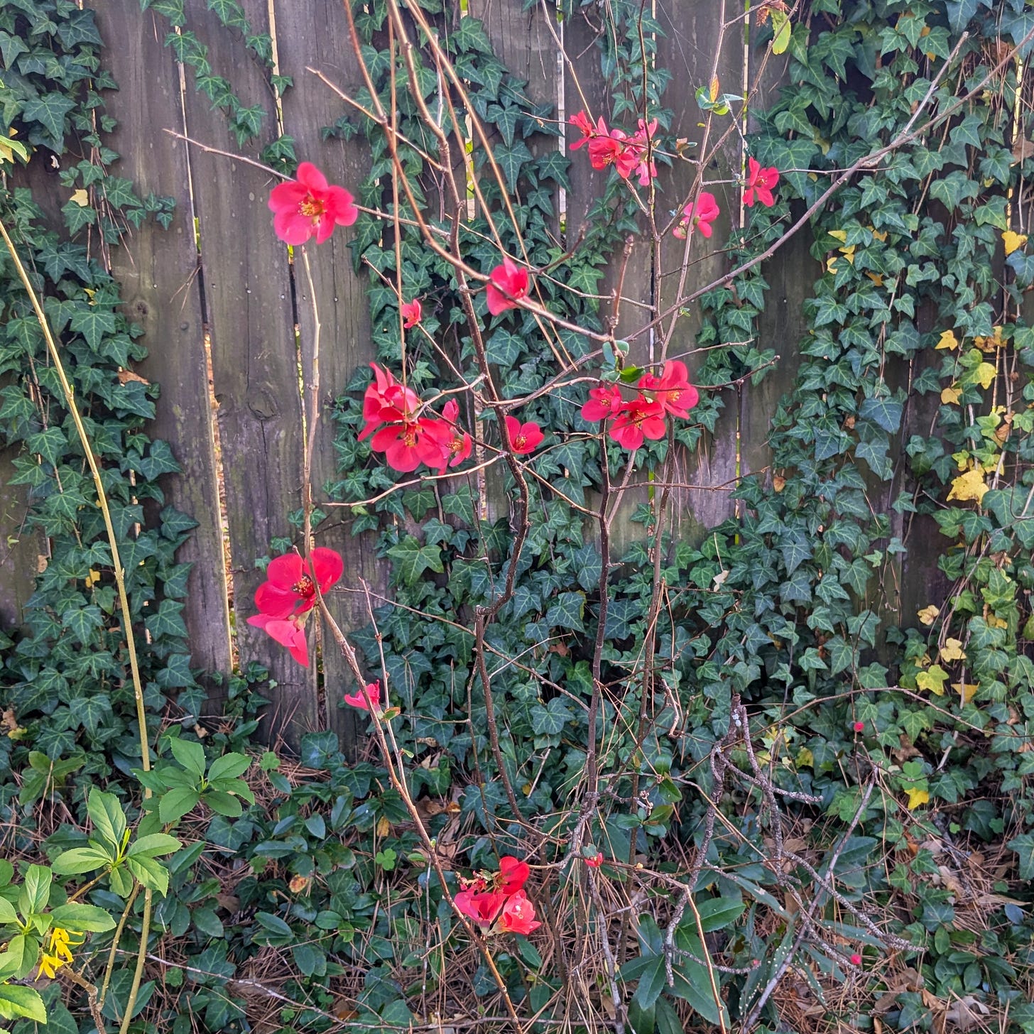 While in the exercise/storage room, I happened to glance out the south window. And suddenly I remembered that we have quince: