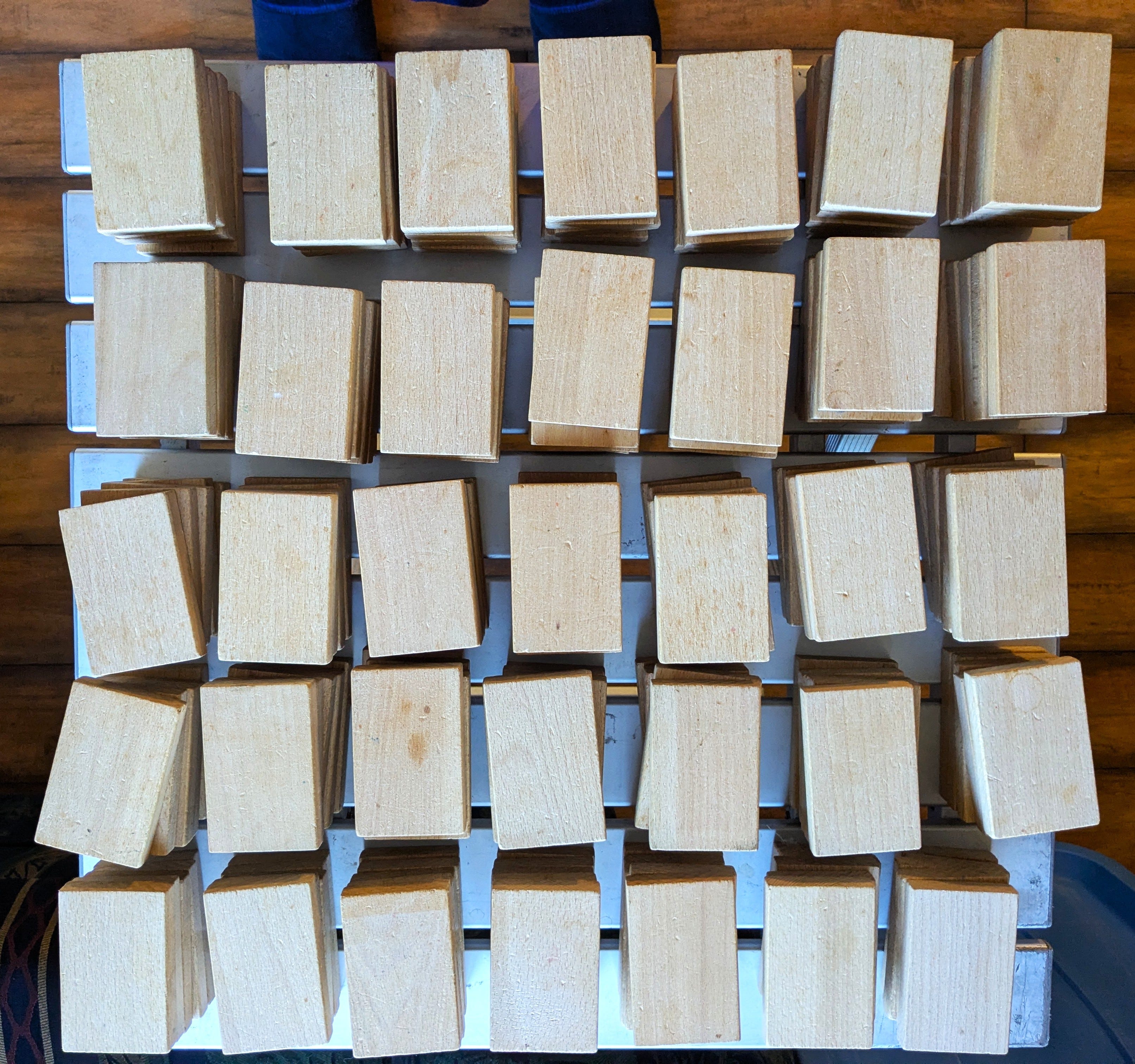 So this morning I asked Jasper to find the box containing the plain wood blocks and he brought it down from the attic. There is no longer any reason for me to keep those blocks. So I set about stacking them so I could count and see how many we have: