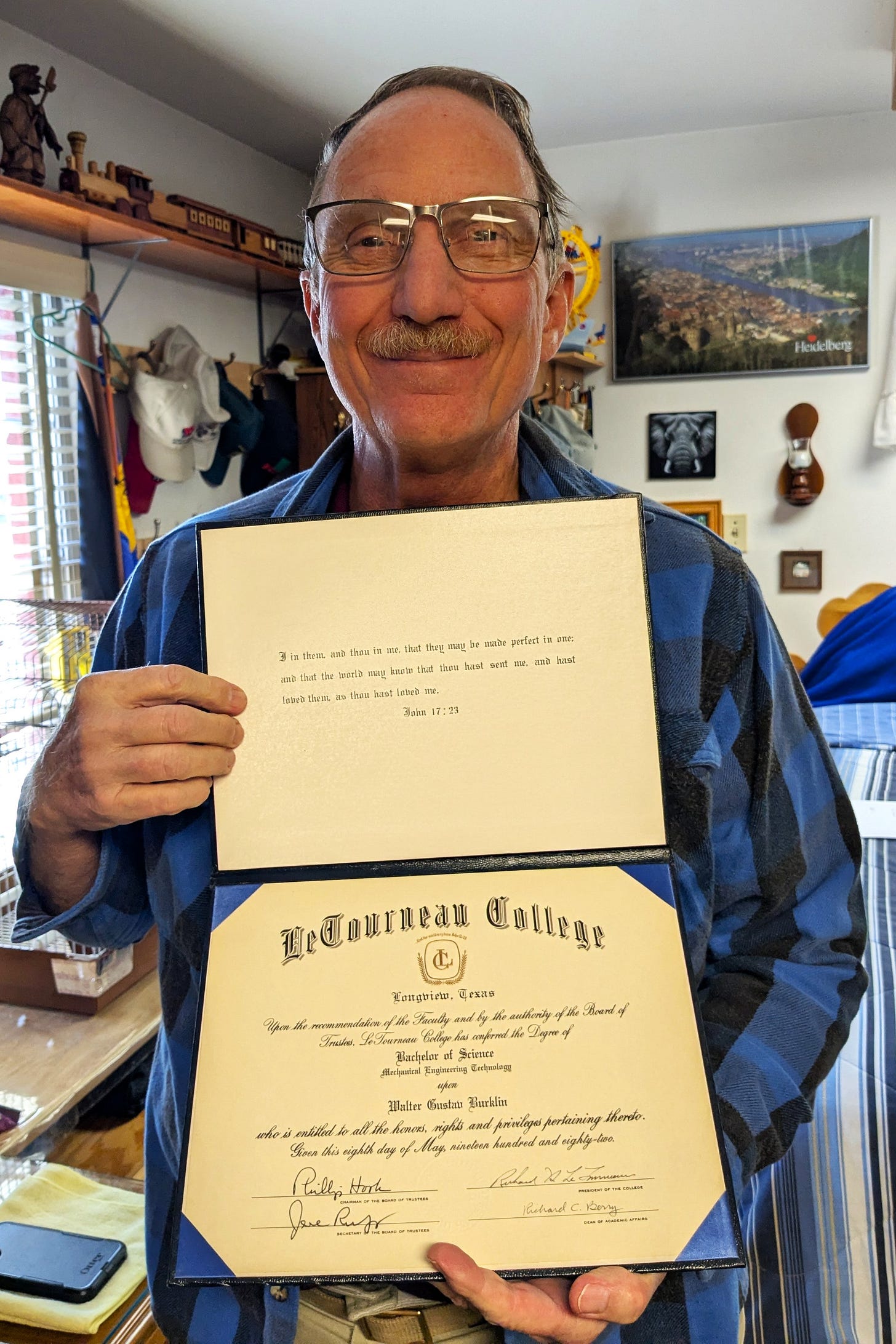 He had to pay $35 to get a replacement diploma, and when he got home and inspected it, he found it to be hilariously inaccurate. All the signatures were wrong, of course, and even his degree was not accurate. Not only did it claim he graduated from “LeTourneau University” when in fact we both graduated from “LeTourneau College,” but the funniest part was the claim that his graduation date was May 8, 2082. Excuse me? He’s a pretty amazing guy, but he can’t have graduated from college in the future.