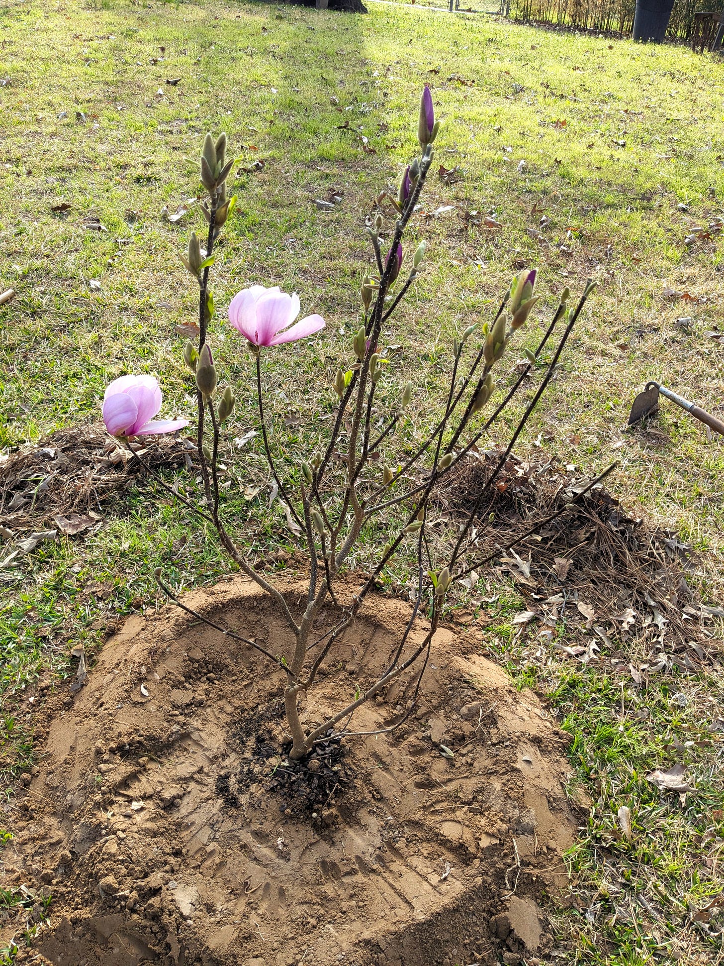 This afternoon we drove up to Lowe’s so Walter could get the last little thing he needs for the dollhouse. Then we continued to the nursery where we picked out a “cheap” tulip tree. Every spring we try to buy one new thing for the yard, and this year we came home with Betty: