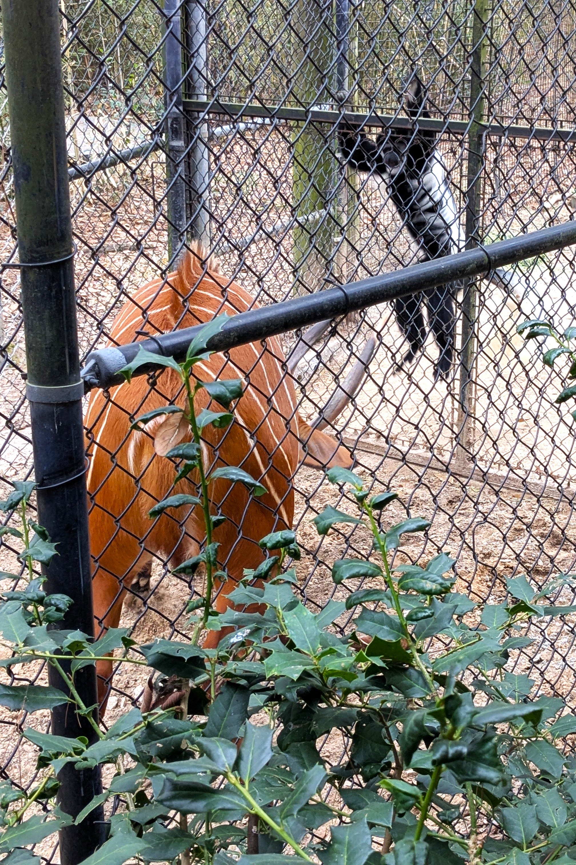 Then, they let the bongos out of their barn, but there’s a mesh gate between the bongos and the larger area where the colobus are. And the gate stayed closed because: