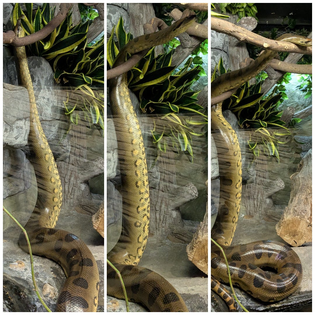 Our first big thrill came in the reptile building, where the giant anaconda was on the move. First it lifted its head, then ever so slowly pulled its coils out of the water and reached higher and gradually pulled most of its body up onto a branch.