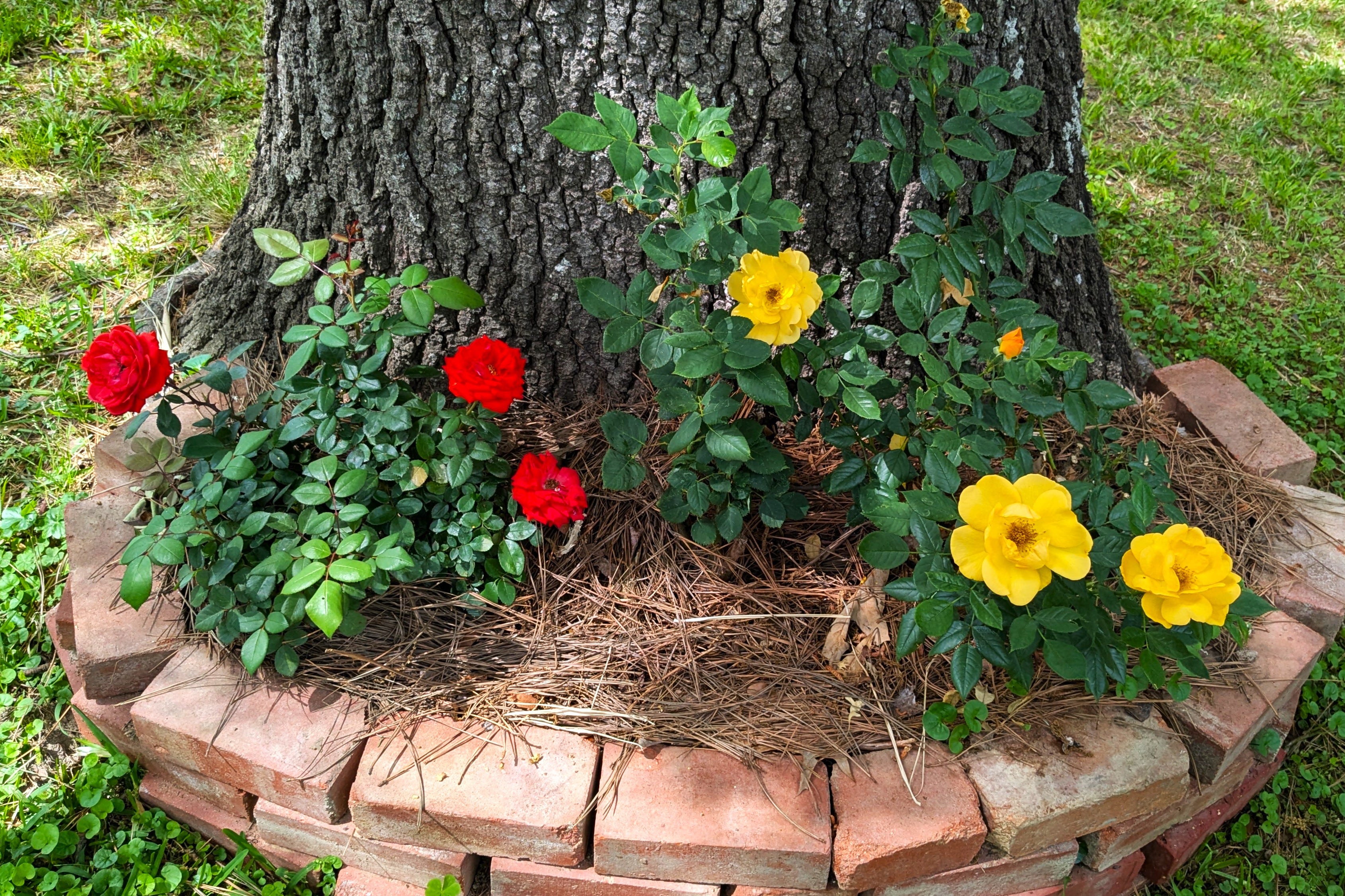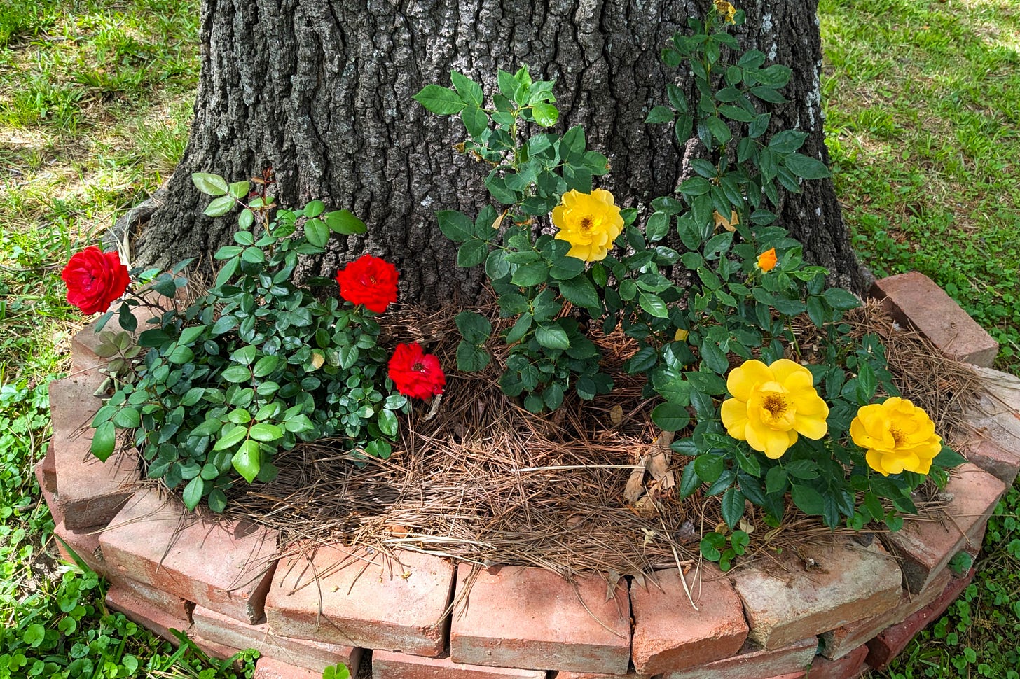Two of our backyard roses are doing well, The one in the middle apparently didn’t get the memo about the blooming schedule.
