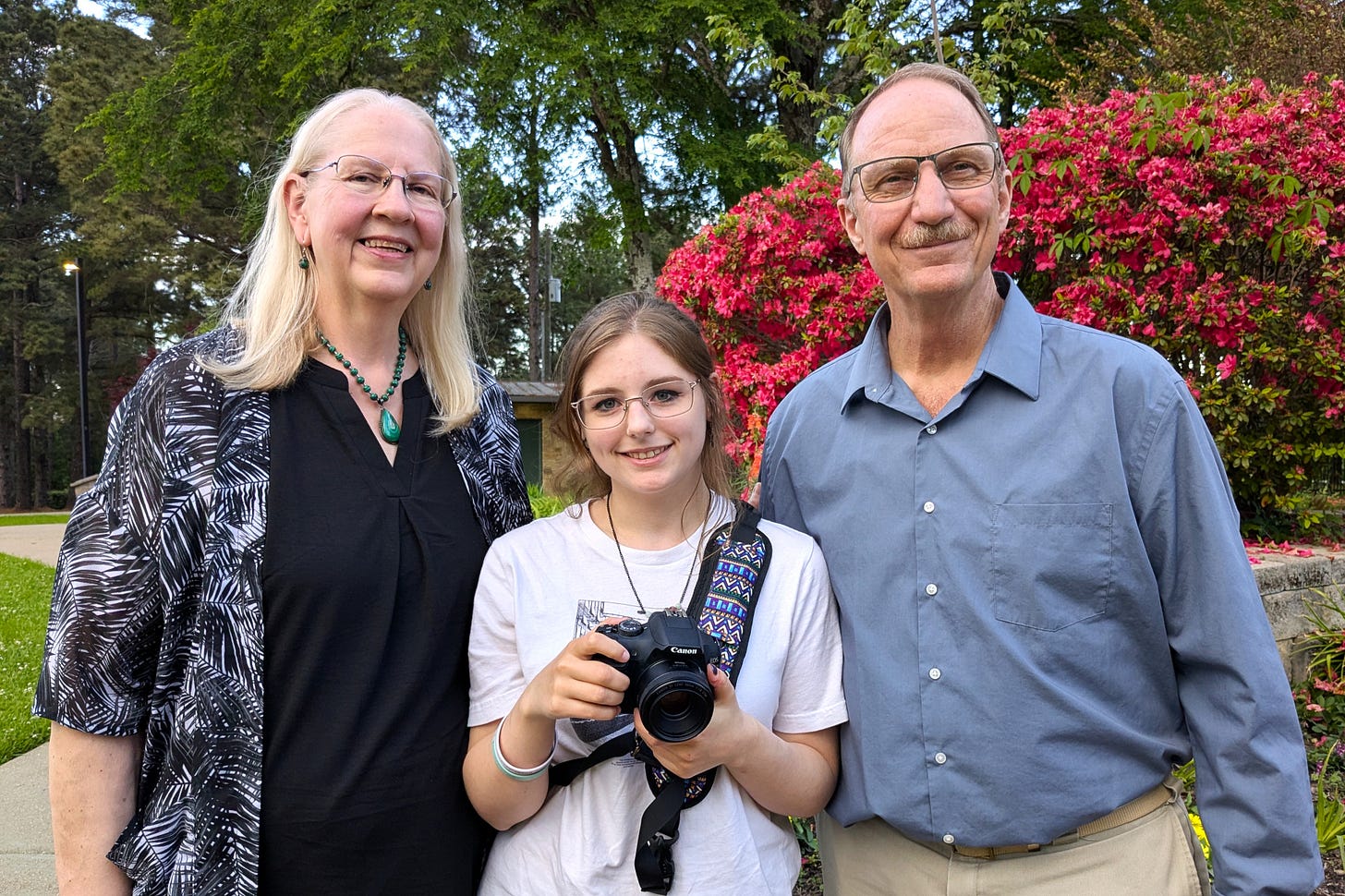Katherine and her mother arrived and we waited our turn to pose in front of the large flowering shrub. I figured since we’d be photographed in front of bright flowers, we should not wear color ourselves, so Walter wore a grey shirt and I wore a black shirt with a black and white duster. I hardly ever wear this duster, because it was given to me by one of my estranged daughters, and I kind of want it to last forever. It’s tangible evidence that she once loved me.